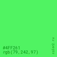 Цвет #4FF261 в цветовой модели RGB обозначается тремя октетами (79, 242, 97) в десятичном формате и #4FF261 в шестнадцатиричном (hex) формате, которые являются интенсивностью красного 79 (hex 4F), интенсивность зелёного 242 (hex F2) и интенсивность синего 97 (hex 61).