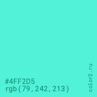 Цвет #4FF2D5 в цветовой модели RGB обозначается тремя октетами (79, 242, 213) в десятичном формате и #4FF2D5 в шестнадцатиричном (hex) формате, которые являются интенсивностью красного 79 (hex 4F), интенсивность зелёного 242 (hex F2) и интенсивность синего 213 (hex D5).