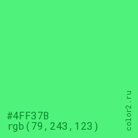 Цвет #4FF37B в цветовой модели RGB обозначается тремя октетами (79, 243, 123) в десятичном формате и #4FF37B в шестнадцатиричном (hex) формате, которые являются интенсивностью красного 79 (hex 4F), интенсивность зелёного 243 (hex F3) и интенсивность синего 123 (hex 7B).
