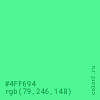Цвет #4FF694 в цветовой модели RGB обозначается тремя октетами (79, 246, 148) в десятичном формате и #4FF694 в шестнадцатиричном (hex) формате, которые являются интенсивностью красного 79 (hex 4F), интенсивность зелёного 246 (hex F6) и интенсивность синего 148 (hex 94).