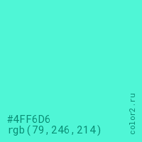Цвет #4FF6D6 в цветовой модели RGB обозначается тремя октетами (79, 246, 214) в десятичном формате и #4FF6D6 в шестнадцатиричном (hex) формате, которые являются интенсивностью красного 79 (hex 4F), интенсивность зелёного 246 (hex F6) и интенсивность синего 214 (hex D6).