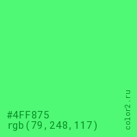 Цвет #4FF875 в цветовой модели RGB обозначается тремя октетами (79, 248, 117) в десятичном формате и #4FF875 в шестнадцатиричном (hex) формате, которые являются интенсивностью красного 79 (hex 4F), интенсивность зелёного 248 (hex F8) и интенсивность синего 117 (hex 75).