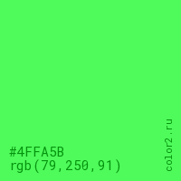 Цвет #4FFA5B в цветовой модели RGB обозначается тремя октетами (79, 250, 91) в десятичном формате и #4FFA5B в шестнадцатиричном (hex) формате, которые являются интенсивностью красного 79 (hex 4F), интенсивность зелёного 250 (hex FA) и интенсивность синего 91 (hex 5B).