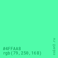 Цвет #4FFAA8 в цветовой модели RGB обозначается тремя октетами (79, 250, 168) в десятичном формате и #4FFAA8 в шестнадцатиричном (hex) формате, которые являются интенсивностью красного 79 (hex 4F), интенсивность зелёного 250 (hex FA) и интенсивность синего 168 (hex A8).