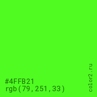 Цвет #4FFB21 в цветовой модели RGB обозначается тремя октетами (79, 251, 33) в десятичном формате и #4FFB21 в шестнадцатиричном (hex) формате, которые являются интенсивностью красного 79 (hex 4F), интенсивность зелёного 251 (hex FB) и интенсивность синего 33 (hex 21).