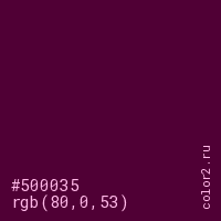 Цвет #500035 в цветовой модели RGB обозначается тремя октетами (80, 0, 53) в десятичном формате и #500035 в шестнадцатиричном (hex) формате, которые являются интенсивностью красного 80 (hex 50), интенсивность зелёного 0 (hex 00) и интенсивность синего 53 (hex 35).
