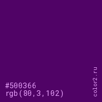 Цвет #500366 в цветовой модели RGB обозначается тремя октетами (80, 3, 102) в десятичном формате и #500366 в шестнадцатиричном (hex) формате, которые являются интенсивностью красного 80 (hex 50), интенсивность зелёного 3 (hex 03) и интенсивность синего 102 (hex 66).