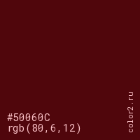 Цвет #50060C в цветовой модели RGB обозначается тремя октетами (80, 6, 12) в десятичном формате и #50060C в шестнадцатиричном (hex) формате, которые являются интенсивностью красного 80 (hex 50), интенсивность зелёного 6 (hex 06) и интенсивность синего 12 (hex 0C).