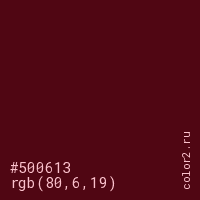 Цвет #500613 в цветовой модели RGB обозначается тремя октетами (80, 6, 19) в десятичном формате и #500613 в шестнадцатиричном (hex) формате, которые являются интенсивностью красного 80 (hex 50), интенсивность зелёного 6 (hex 06) и интенсивность синего 19 (hex 13).