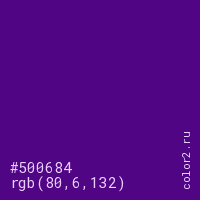 Цвет #500684 в цветовой модели RGB обозначается тремя октетами (80, 6, 132) в десятичном формате и #500684 в шестнадцатиричном (hex) формате, которые являются интенсивностью красного 80 (hex 50), интенсивность зелёного 6 (hex 06) и интенсивность синего 132 (hex 84).