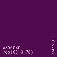 Цвет #50084C в цветовой модели RGB обозначается тремя октетами (80, 8, 76) в десятичном формате и #50084C в шестнадцатиричном (hex) формате, которые являются интенсивностью красного 80 (hex 50), интенсивность зелёного 8 (hex 08) и интенсивность синего 76 (hex 4C).