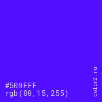 Цвет #500FFF в цветовой модели RGB обозначается тремя октетами (80, 15, 255) в десятичном формате и #500FFF в шестнадцатиричном (hex) формате, которые являются интенсивностью красного 80 (hex 50), интенсивность зелёного 15 (hex 0F) и интенсивность синего 255 (hex FF).