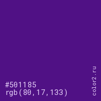 Цвет #501185 в цветовой модели RGB обозначается тремя октетами (80, 17, 133) в десятичном формате и #501185 в шестнадцатиричном (hex) формате, которые являются интенсивностью красного 80 (hex 50), интенсивность зелёного 17 (hex 11) и интенсивность синего 133 (hex 85).