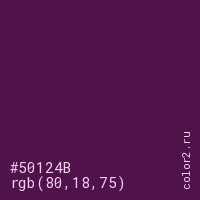 Цвет #50124B в цветовой модели RGB обозначается тремя октетами (80, 18, 75) в десятичном формате и #50124B в шестнадцатиричном (hex) формате, которые являются интенсивностью красного 80 (hex 50), интенсивность зелёного 18 (hex 12) и интенсивность синего 75 (hex 4B).