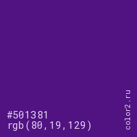 Цвет #501381 в цветовой модели RGB обозначается тремя октетами (80, 19, 129) в десятичном формате и #501381 в шестнадцатиричном (hex) формате, которые являются интенсивностью красного 80 (hex 50), интенсивность зелёного 19 (hex 13) и интенсивность синего 129 (hex 81).