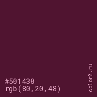 Цвет #501430 в цветовой модели RGB обозначается тремя октетами (80, 20, 48) в десятичном формате и #501430 в шестнадцатиричном (hex) формате, которые являются интенсивностью красного 80 (hex 50), интенсивность зелёного 20 (hex 14) и интенсивность синего 48 (hex 30).