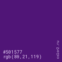 Цвет #501577 в цветовой модели RGB обозначается тремя октетами (80, 21, 119) в десятичном формате и #501577 в шестнадцатиричном (hex) формате, которые являются интенсивностью красного 80 (hex 50), интенсивность зелёного 21 (hex 15) и интенсивность синего 119 (hex 77).