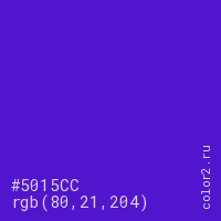 Цвет #5015CC в цветовой модели RGB обозначается тремя октетами (80, 21, 204) в десятичном формате и #5015CC в шестнадцатиричном (hex) формате, которые являются интенсивностью красного 80 (hex 50), интенсивность зелёного 21 (hex 15) и интенсивность синего 204 (hex CC).