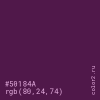 Цвет #50184A в цветовой модели RGB обозначается тремя октетами (80, 24, 74) в десятичном формате и #50184A в шестнадцатиричном (hex) формате, которые являются интенсивностью красного 80 (hex 50), интенсивность зелёного 24 (hex 18) и интенсивность синего 74 (hex 4A).