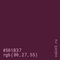 Цвет #501B37 в цветовой модели RGB обозначается тремя октетами (80, 27, 55) в десятичном формате и #501B37 в шестнадцатиричном (hex) формате, которые являются интенсивностью красного 80 (hex 50), интенсивность зелёного 27 (hex 1B) и интенсивность синего 55 (hex 37).