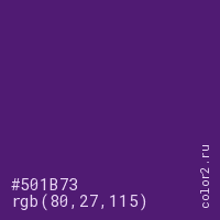 Цвет #501B73 в цветовой модели RGB обозначается тремя октетами (80, 27, 115) в десятичном формате и #501B73 в шестнадцатиричном (hex) формате, которые являются интенсивностью красного 80 (hex 50), интенсивность зелёного 27 (hex 1B) и интенсивность синего 115 (hex 73).
