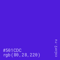 Цвет #501CDC в цветовой модели RGB обозначается тремя октетами (80, 28, 220) в десятичном формате и #501CDC в шестнадцатиричном (hex) формате, которые являются интенсивностью красного 80 (hex 50), интенсивность зелёного 28 (hex 1C) и интенсивность синего 220 (hex DC).