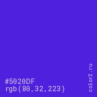 Цвет #5020DF в цветовой модели RGB обозначается тремя октетами (80, 32, 223) в десятичном формате и #5020DF в шестнадцатиричном (hex) формате, которые являются интенсивностью красного 80 (hex 50), интенсивность зелёного 32 (hex 20) и интенсивность синего 223 (hex DF).