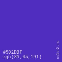 Цвет #502DBF в цветовой модели RGB обозначается тремя октетами (80, 45, 191) в десятичном формате и #502DBF в шестнадцатиричном (hex) формате, которые являются интенсивностью красного 80 (hex 50), интенсивность зелёного 45 (hex 2D) и интенсивность синего 191 (hex BF).