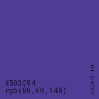 Цвет #503C94 в цветовой модели RGB обозначается тремя октетами (80, 60, 148) в десятичном формате и #503C94 в шестнадцатиричном (hex) формате, которые являются интенсивностью красного 80 (hex 50), интенсивность зелёного 60 (hex 3C) и интенсивность синего 148 (hex 94).