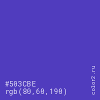 Цвет #503CBE в цветовой модели RGB обозначается тремя октетами (80, 60, 190) в десятичном формате и #503CBE в шестнадцатиричном (hex) формате, которые являются интенсивностью красного 80 (hex 50), интенсивность зелёного 60 (hex 3C) и интенсивность синего 190 (hex BE).