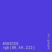 Цвет #503CDE в цветовой модели RGB обозначается тремя октетами (80, 60, 222) в десятичном формате и #503CDE в шестнадцатиричном (hex) формате, которые являются интенсивностью красного 80 (hex 50), интенсивность зелёного 60 (hex 3C) и интенсивность синего 222 (hex DE).