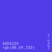 Цвет #503CE9 в цветовой модели RGB обозначается тремя октетами (80, 60, 233) в десятичном формате и #503CE9 в шестнадцатиричном (hex) формате, которые являются интенсивностью красного 80 (hex 50), интенсивность зелёного 60 (hex 3C) и интенсивность синего 233 (hex E9).