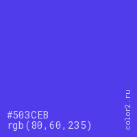 Цвет #503CEB в цветовой модели RGB обозначается тремя октетами (80, 60, 235) в десятичном формате и #503CEB в шестнадцатиричном (hex) формате, которые являются интенсивностью красного 80 (hex 50), интенсивность зелёного 60 (hex 3C) и интенсивность синего 235 (hex EB).