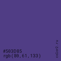 Цвет #503D85 в цветовой модели RGB обозначается тремя октетами (80, 61, 133) в десятичном формате и #503D85 в шестнадцатиричном (hex) формате, которые являются интенсивностью красного 80 (hex 50), интенсивность зелёного 61 (hex 3D) и интенсивность синего 133 (hex 85).