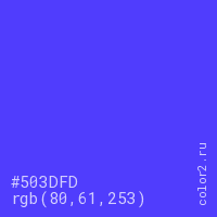Цвет #503DFD в цветовой модели RGB обозначается тремя октетами (80, 61, 253) в десятичном формате и #503DFD в шестнадцатиричном (hex) формате, которые являются интенсивностью красного 80 (hex 50), интенсивность зелёного 61 (hex 3D) и интенсивность синего 253 (hex FD).