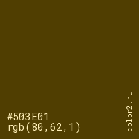 Цвет #503E01 в цветовой модели RGB обозначается тремя октетами (80, 62, 1) в десятичном формате и #503E01 в шестнадцатиричном (hex) формате, которые являются интенсивностью красного 80 (hex 50), интенсивность зелёного 62 (hex 3E) и интенсивность синего 1 (hex 01).