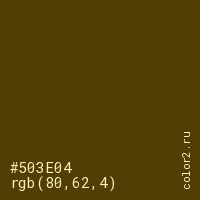 Цвет #503E04 в цветовой модели RGB обозначается тремя октетами (80, 62, 4) в десятичном формате и #503E04 в шестнадцатиричном (hex) формате, которые являются интенсивностью красного 80 (hex 50), интенсивность зелёного 62 (hex 3E) и интенсивность синего 4 (hex 04).