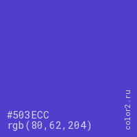 Цвет #503ECC в цветовой модели RGB обозначается тремя октетами (80, 62, 204) в десятичном формате и #503ECC в шестнадцатиричном (hex) формате, которые являются интенсивностью красного 80 (hex 50), интенсивность зелёного 62 (hex 3E) и интенсивность синего 204 (hex CC).