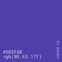 Цвет #503FAB в цветовой модели RGB обозначается тремя октетами (80, 63, 171) в десятичном формате и #503FAB в шестнадцатиричном (hex) формате, которые являются интенсивностью красного 80 (hex 50), интенсивность зелёного 63 (hex 3F) и интенсивность синего 171 (hex AB).