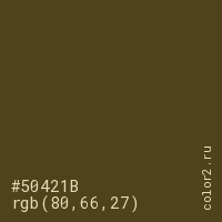 Цвет #50421B в цветовой модели RGB обозначается тремя октетами (80, 66, 27) в десятичном формате и #50421B в шестнадцатиричном (hex) формате, которые являются интенсивностью красного 80 (hex 50), интенсивность зелёного 66 (hex 42) и интенсивность синего 27 (hex 1B).