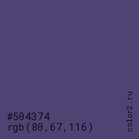 Цвет #504374 в цветовой модели RGB обозначается тремя октетами (80, 67, 116) в десятичном формате и #504374 в шестнадцатиричном (hex) формате, которые являются интенсивностью красного 80 (hex 50), интенсивность зелёного 67 (hex 43) и интенсивность синего 116 (hex 74).
