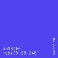 Цвет #5044F0 в цветовой модели RGB обозначается тремя октетами (80, 68, 240) в десятичном формате и #5044F0 в шестнадцатиричном (hex) формате, которые являются интенсивностью красного 80 (hex 50), интенсивность зелёного 68 (hex 44) и интенсивность синего 240 (hex F0).