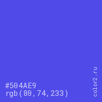 Цвет #504AE9 в цветовой модели RGB обозначается тремя октетами (80, 74, 233) в десятичном формате и #504AE9 в шестнадцатиричном (hex) формате, которые являются интенсивностью красного 80 (hex 50), интенсивность зелёного 74 (hex 4A) и интенсивность синего 233 (hex E9).