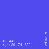 Цвет #504AEF в цветовой модели RGB обозначается тремя октетами (80, 74, 239) в десятичном формате и #504AEF в шестнадцатиричном (hex) формате, которые являются интенсивностью красного 80 (hex 50), интенсивность зелёного 74 (hex 4A) и интенсивность синего 239 (hex EF).