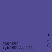 Цвет #504B92 в цветовой модели RGB обозначается тремя октетами (80, 75, 146) в десятичном формате и #504B92 в шестнадцатиричном (hex) формате, которые являются интенсивностью красного 80 (hex 50), интенсивность зелёного 75 (hex 4B) и интенсивность синего 146 (hex 92).