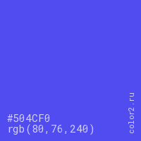 Цвет #504CF0 в цветовой модели RGB обозначается тремя октетами (80, 76, 240) в десятичном формате и #504CF0 в шестнадцатиричном (hex) формате, которые являются интенсивностью красного 80 (hex 50), интенсивность зелёного 76 (hex 4C) и интенсивность синего 240 (hex F0).