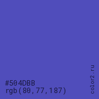 Цвет #504DBB в цветовой модели RGB обозначается тремя октетами (80, 77, 187) в десятичном формате и #504DBB в шестнадцатиричном (hex) формате, которые являются интенсивностью красного 80 (hex 50), интенсивность зелёного 77 (hex 4D) и интенсивность синего 187 (hex BB).