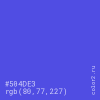 Цвет #504DE3 в цветовой модели RGB обозначается тремя октетами (80, 77, 227) в десятичном формате и #504DE3 в шестнадцатиричном (hex) формате, которые являются интенсивностью красного 80 (hex 50), интенсивность зелёного 77 (hex 4D) и интенсивность синего 227 (hex E3).