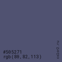 Цвет #505271 в цветовой модели RGB обозначается тремя октетами (80, 82, 113) в десятичном формате и #505271 в шестнадцатиричном (hex) формате, которые являются интенсивностью красного 80 (hex 50), интенсивность зелёного 82 (hex 52) и интенсивность синего 113 (hex 71).