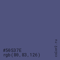 Цвет #50537E в цветовой модели RGB обозначается тремя октетами (80, 83, 126) в десятичном формате и #50537E в шестнадцатиричном (hex) формате, которые являются интенсивностью красного 80 (hex 50), интенсивность зелёного 83 (hex 53) и интенсивность синего 126 (hex 7E).